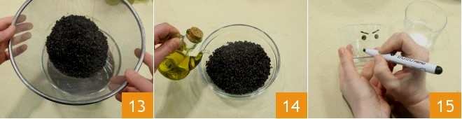 Once cooked, drain the black rice 13 and season it with a drizzle of olive oil 14. Everything is ready to assemble the soup: take wide glasses with a capacity of about 6.5 oz and draw the key features of Frankenstein's face with a black marker: slightly arched eyebrows, eyes, and mouth 15;