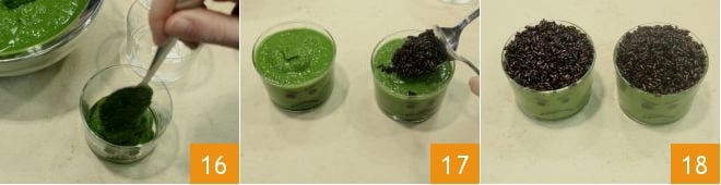 then portion the soup into the glasses 16 and garnish the surface with a couple of tablespoons of black rice 17: they will be Frankenstein's hair. Your Frankenstein soup is ready to amaze your children 18!