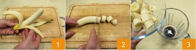 To prepare the banana milkshake, start by peeling the bananas 1 and cutting them into chunks 2. Then place the freshly cut banana pieces into the blender 3.