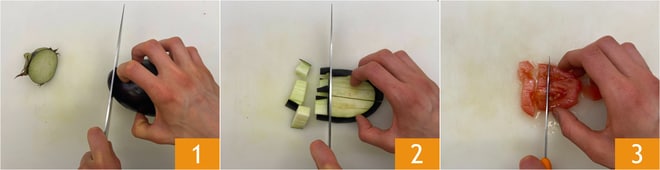 To prepare fregola with eggplants, first wash and dry the eggplants, then remove the stem 1 and cut them into cubes of 1 inch 2. Also, dice the tomatoes 3 and set aside.