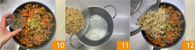 Add the capers 10, stir and let it flavor for a few minutes. Cook the fregola in plenty of salted boiling water 11. Once cooked, drain and add it to the pan 12 and cook just enough to let it absorb the flavors.