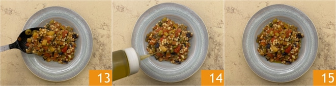 Plate 13, finish with a drizzle of oil 14 and your fregola with eggplants is ready to be served 15.