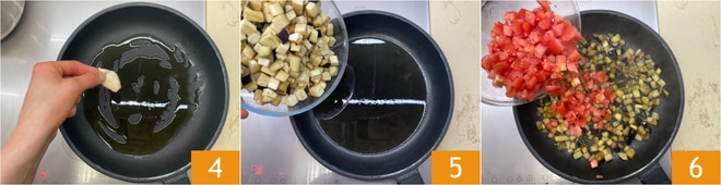 In a pan, pour a drizzle of oil and add the garlic 4, sauté it for a few minutes, then add the eggplants 5. Cook for 15 minutes over a moderate heat. Add the tomatoes 6.