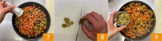 Season with salt and pepper 7 and continue cooking. Meanwhile, slice the olives into rings 8. Once the eggplants have softened, add the olives 9.