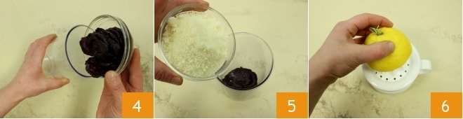 then transfer them to a blender with blades 4, add the grated cheese 5; then squeeze some lemon juice 6, strain it