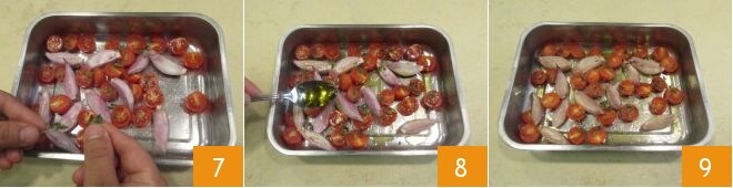 Fragrance with fresh thyme leaves 7 and then season with 1.5 tablespoons of olive oil 8. Mix to flavor and bake in the center of a preheated static oven for 20 minutes at 390°F. Once cooked, remove the tray from the oven and let them cool at room temperature 9.