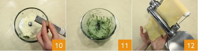 Add the mix of grated cheeses, salt and pepper to taste, and sprinkle with a bit of grated nutmeg 10. Blend everything 11 and transfer the obtained cream into a piping bag; you can keep it in the refrigerator until ready to use. After half an hour, you can roll out the egg pasta using a pasta machine to make a thin sheet, passing the pasta from the thickest to the thinnest setting 12.