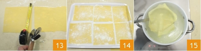 Cut the obtained sheet into 15 squares of 5 inches per side with a fluted pastry cutter (13-14): in this way, you will obtain 8 bundles each composed of 2 squares. Prepare two pots: in one, bring salted water to a boil where you will cook the fresh pasta squares for a few moments 15 (set aside the boiling water); in the other, pour cold water to immerse the cooked pasta for a moment to stop the cooking.
