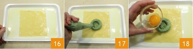After these steps, drain the squares on an oiled tray 16. In the center of 8 squares, create a circle of herb and cheese filling, and then another circle along the perimeter of the first one 17; in this way, you will have made a small nest that you will fill with the yolk 18.
