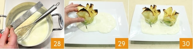 Adjust with salt and pepper and flavor the fondue with some grated nutmeg 28. When the fondue coats a wooden spoon, turn off the heat. At this point, broil the bundles at 482°F for 3 minutes, then pour the fondue as a mirror on the serving plates 29 and place the fresh pasta bundle with molten yolk on top 30 to serve hot.