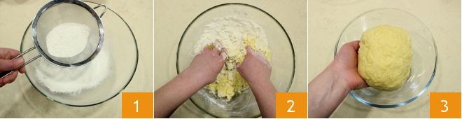 To prepare the egg pasta bundle with molten yolk, start with the egg pasta dough: in a bowl (or on a pastry board) sift the flour 1 and place the room temperature eggs in the center. Mix with a fork at first, then continue kneading with your hands 2. When the mixture is more homogeneous 3, transfer it to a work surface,