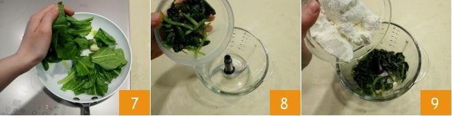 and sauté them in a pan with a drizzle of oil and a whole garlic clove 7. When they are cooked, remove the garlic and transfer them to a blender cup to blend them together with the ricotta (8-9).