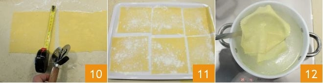 Divide the dough sheet obtained into rectangles of 5.5x8.25 inches 13 and place them on a slightly floured tray 14 as you make them. Then continue with the rest of the fresh pasta. Then cook it in a large pot with plenty of salted water to taste (do not boil the water too hard to avoid the pasta rectangles from breaking apart); a few seconds will be enough, then drain the pasta 12 and plunge it into cold water. Then transfer it to an oiled tray.
