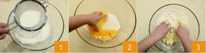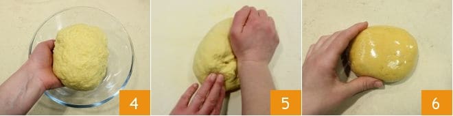 Work the dough in the bowl, then when it becomes more compact 4, handle it on a slightly floured work surface 5; when it is smooth and homogeneous, wrap it in plastic wrap and let it rest for 30 minutes at room temperature 5.