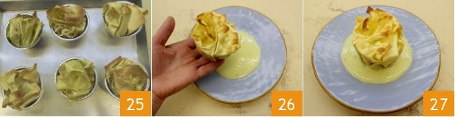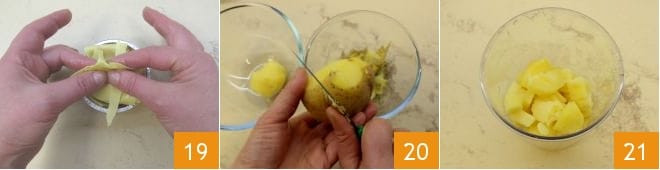 Take the edges of the pasta and pinch them with your fingers to close like a pouch 19; complete all the bundles and cook in the oven under the grill at 464°F for 4-5 minutes. Meanwhile, prepare the potato cream: peel the still-hot potatoes 20 and cut them into pieces 21