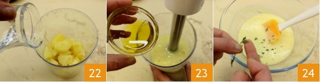 Add the water 22 and blend the potatoes with an immersion blender, adding the oil in a thin stream 23. Then pour the cream obtained into a small bowl and flavor with thyme leaves 24.