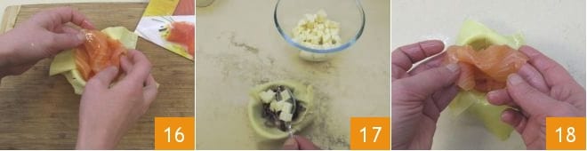 Place the pasta rectangle in a disposable aluminum mold and lay a slice of salmon 16, then the radicchio and diced toma 17, then continue with the salmon 18