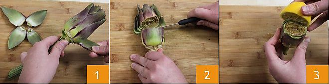 The first step in preparing fried artichokes with mustard is to clean the artichokes: remove the tougher outer leaves 1, and cut off the top of the artichokes 2 and the stem just below the base of the artichoke (click How to clean artichokes to see how) keeping only the heart. To prevent the artichokes from darkening during preparation, sprinkle them with half a lemon 3.