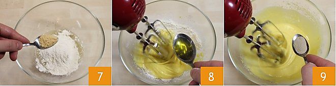and the mustard, and with the help of a whisk or mixer, make a batter 7 adding the tablespoon of oil 8 and the teaspoon of baking powder 9 during preparation; if the batter is too thick, add 1 or 2 tablespoons of warm water (otherwise, add a little flour).