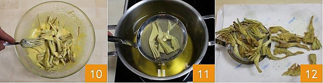Pour the drained and dried artichokes into the batter and let them soak well for a few minutes 10. Meanwhile, heat the seed oil (or if you prefer olive oil), into which you will dip the various artichoke slices one by one, making sure they do not stick together 11; turn them over a few times, so they brown on all surfaces. Depending on the size of the artichoke, they will be ready in 5/7 minutes, then remove them from the oil and place them to drain on kitchen paper 12; serve them still hot, possibly sprinkled with a pinch of salt.