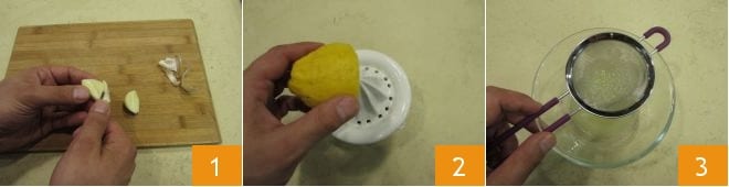To prepare the fried asparagus with sauce, first start by making the accompanying aioli sauce. Cut the garlic cloves in half and remove the central part (the germ) with the help of a small knife 1. Then squeeze the lemon juice 2 and strain it 3.
