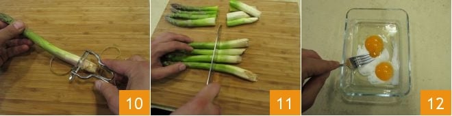 In the meantime, focus on the cleaning of the asparagus. Peel them from top to bottom until the stem turns white 10, then cut off the white part, which is the hardest, with a knife 11. In a separate small bowl, crack the eggs and beat them together with the milk 12.