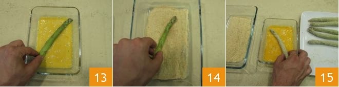 Rinse the asparagus well, pat them dry with a kitchen cloth, and dip them first in the egg beaten with milk 13, then in the breadcrumbs 14, and again in the egg 15.