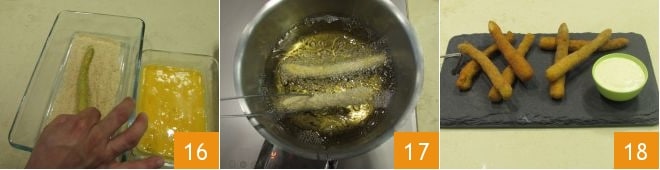Complete the double breading by finally passing the asparagus in the breadcrumbs one last time 16. Then heat the oil to a temperature of 356°F (you can measure the temperature with a kitchen thermometer), immerse the asparagus 17, and fry them until they are golden brown. Drain the asparagus well and place them on a plate with a paper towel to remove any excess oil. Serve the fried asparagus still hot, accompanied by the aioli sauce 18.