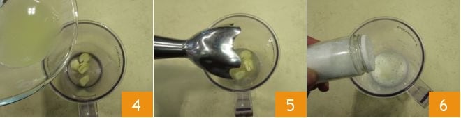 Place the garlic and lemon juice in an immersion blender cup 4 and blend 5 to finely chop the garlic. Add the salt and pepper 6.