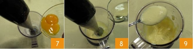 Add the room-temperature egg yolks 7, continuing to blend, and once they are well combined, pour in the oil slowly and in a thin stream while still blending 8, until you achieve a thick sauce 9. To prevent the sauce from separating, avoid adding too much oil at once, which would prevent proper emulsification with the yolk. Place your sauce in a small bowl and store it in the refrigerator.