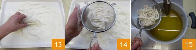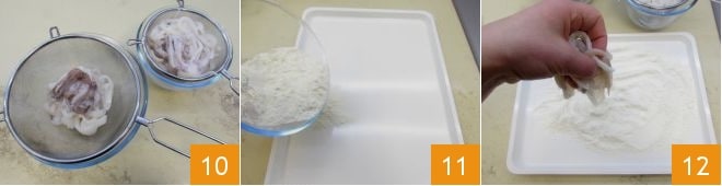 then place everything in a colander to remove excess water 10. Now take care of the breading: distribute the flour on a tray 11, then place the calamari rings 12,