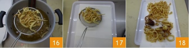 mixing them so that the breading adheres well on all sides 13. Pass them in a colander to remove excess flour 14. Place a large pot on the stove with oil for frying, checking that the temperature reaches 338°F with the help of a kitchen thermometer. At this point, fry the breaded rings a few at a time for 3-4 minutes 15, until they are golden and crispy.