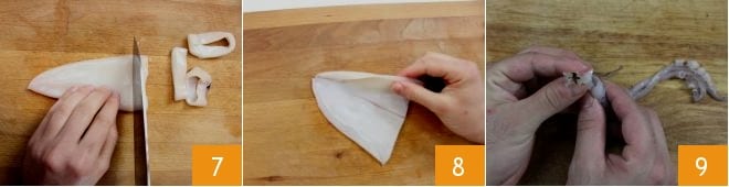 Cut the mantle into rings with a thickness of 0.2 inches 7 or alternatively, you can cut thin strips: open the mantle like a book, make an incision at the end with a knife, divide it in half, and cut strips 8. Take the tentacles and remove the central tooth by opening them outward with your hands and pushing up the central part (the mouth) 9,