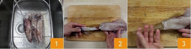 To prepare fried calamari, start with the cleaning of the calamari: rinse them under plenty of fresh running water 1, then with your hands gently detach the head from the mantle 2. Once the head is extracted, still with your hands, look for the transparent cartilage quill located in the mantle and gently extract it 3.