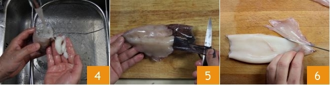 Pass the calamari again under running water 4, wash it thoroughly, and use your hands to extract the innards from the mantle. Then proceed to remove the outer skin: make a small incision at the end of the mantle with a knife, just enough to grab an edge of the skin, and peel off the covering completely with your hands or with the help of a knife 5. To finish cleaning the mantle, still with a knife, remove the fins 6.