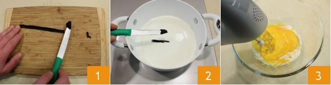 To prepare the custard, take the vanilla bean, cut it with a small knife, and scrape out the seeds 1. Add the seeds and the vanilla pod to milk and cream placed on the stove (you can also replace 50 g of cream with the same amount of milk) 2 (alternatively, you can also flavor with the zest of an orange or lemon). Turn on the heat and when the mixture is about to boil, turn off the heat and let the vanilla infuse for at least 5 minutes. Meanwhile, continue the preparation by separating the egg whites from the yolks; collect the latter in a large bowl and add the sugar (with the leftover egg whites you can make a delicious Angel Cake, meringues, or cat's tongues). Beat the egg yolks and sugar with an electric mixer 3 or a whisk to obtain a homogeneous cream.