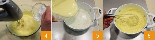 When they are white and frothy, add the sifted cornstarch 4 or rice starch and mix it with the rest of the mixture; Remove the vanilla bean from the heated milk and cream and add the egg mixture 5. Turn the heat back on and stir continuously with a whisk to thicken the mixture 6.