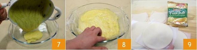 When the custard is thick, turn off the heat and pour it into a wide and shallow bowl 7; immediately cover it with cling film in contact 8 to prevent the annoying film from forming; then let it cool first at room temperature and then in the refrigerator. Take the pastry discs 9
