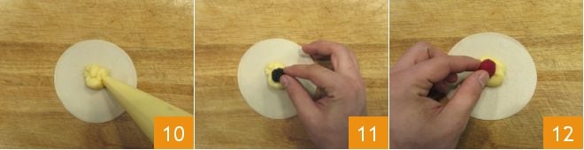 and with the help of a disposable piping bag without a nozzle, fill each disc with a central tuft of cream (about 1 oz) 10; place a blueberry or a raspberry (or other berries of your choice), you can make half the discs one way and the other half the other (11-12).