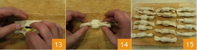 Then roll the disc onto itself to form a cylinder 13, then pinch the edges near the filling to create a shape similar to a candy 14, making sure to seal the content well. Once the candies are ready 15