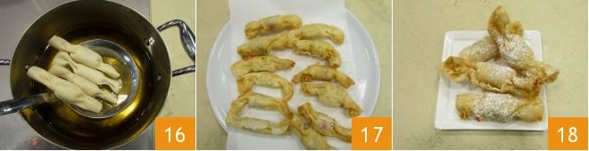you can fry them in plenty of vegetable oil brought to a temperature of 338-356°F maximum (checked with a kitchen thermometer); fry a few candies at a time 16 for just a few moments until golden; then place them on a tray lined with paper towels 17. Serve the fried candies with custard and berries still warm, dusted with powdered sugar!