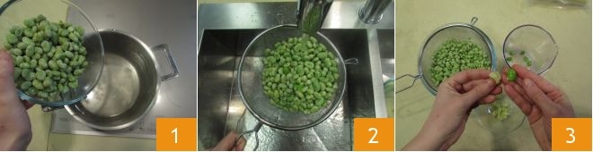 To prepare the Fried Pecorino with Fava Bean Cream, start with the latter. First, blanch the fava beans in boiling salted water 1 for about 5 minutes. Then drain them and cool under running water 2. Remove the skin from each bean 3 and place them in a mixer cup.