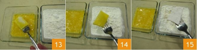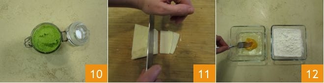 At this point, place a pan with oil on the heat and warm it up to 338°F. Meanwhile, pass the Pecorino slices first in the egg 13 and then in the rice flour (14-15), to create a very light breading.