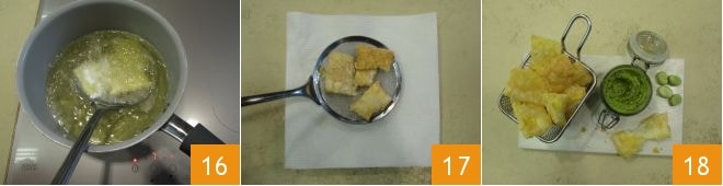 Immerse a few pieces at a time 16 and fry them for 2-3 minutes until they are well golden, then drain them and transfer them to a tray lined with paper towels 17. Finish frying the Pecorino chips and serve them with the fava bean cream 18!
