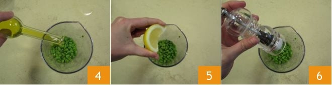 Add the oil 4, a squeeze of lemon 5, a pinch of salt, and black pepper 6.
