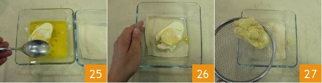 and use a spoon to turn it, so it is completely coated 25. Then pass it in the breadcrumbs 26 and use a slotted spoon to remove excess breadcrumbs 27.