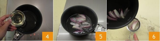 To prepare the fried poached egg with vegetables, bacon, and béarnaise sauce, first clean the shallot and cut it into wedges 1. Then pour the water into a small pot 2, and the vinegar 3.