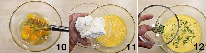 Beat the whole eggs with a whisk 10, then add the ricotta 11, the thyme 12,