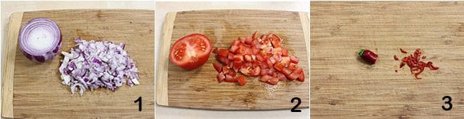To make the baked chickpea omelette, start by preparing all the ingredients: peel and chop the onion 1, wash the tomatoes and dice them 2, then finely chop the parsley, thyme, and half of a fresh red chili pepper (about a teaspoon) 3 .