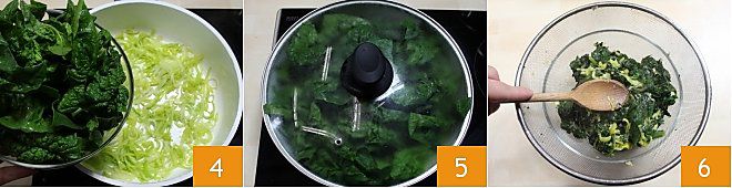 Add the spinach to the pan 4, raise the heat and cook for a few minutes with the lid on 5. When the spinach is soft and well cooked, drain them, squeeze them in a strainer 6